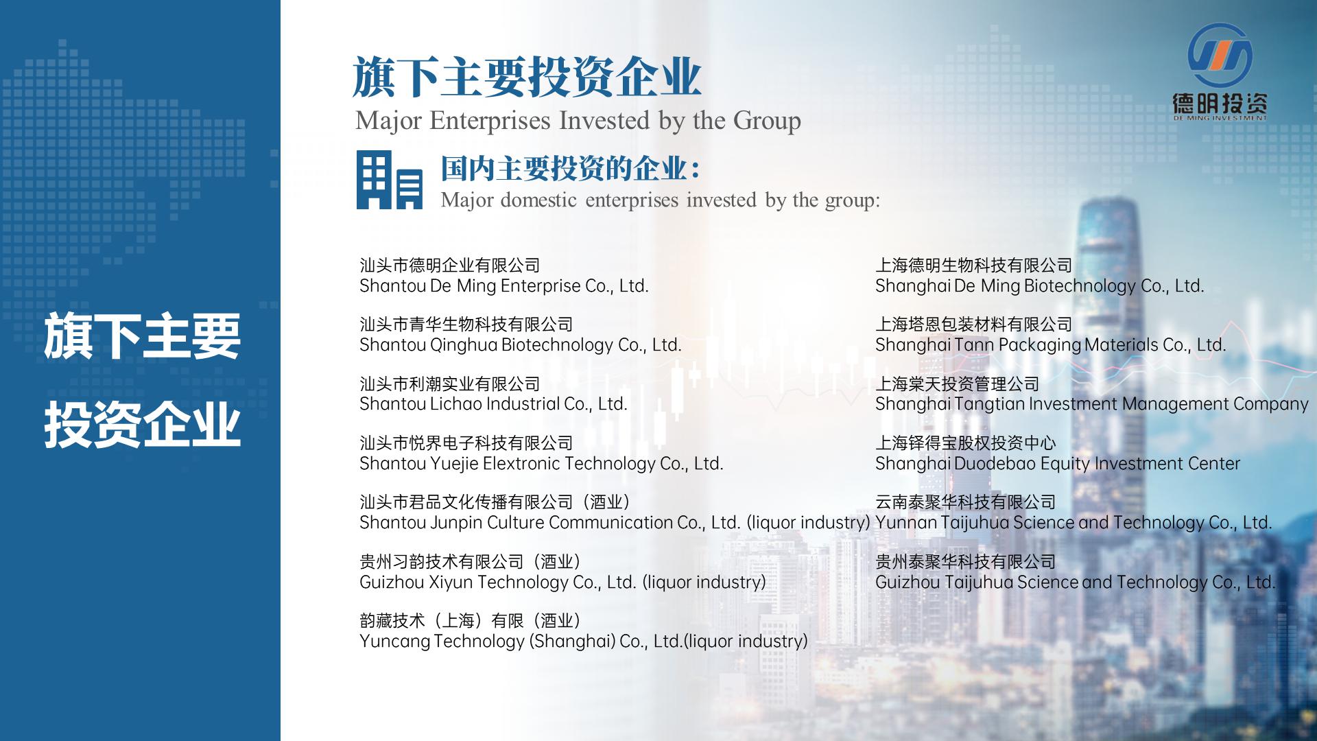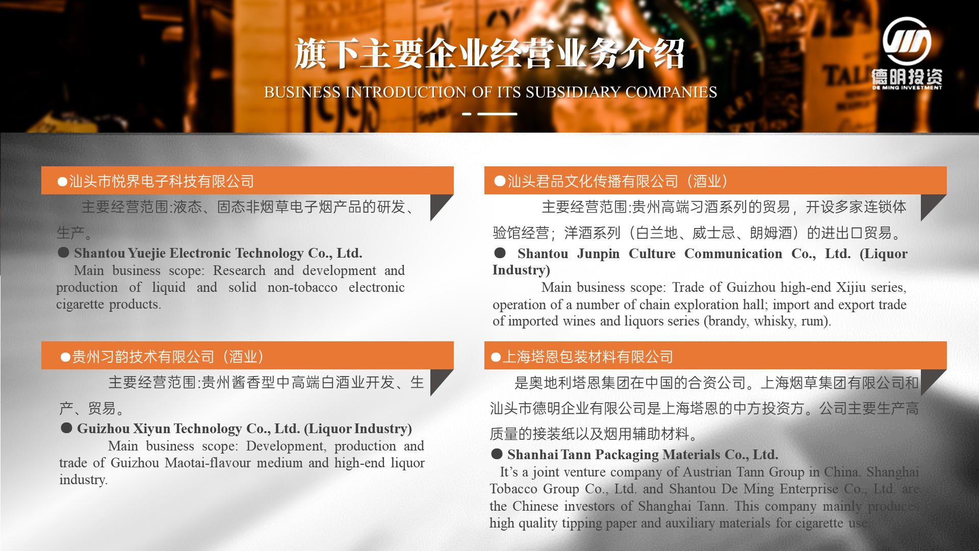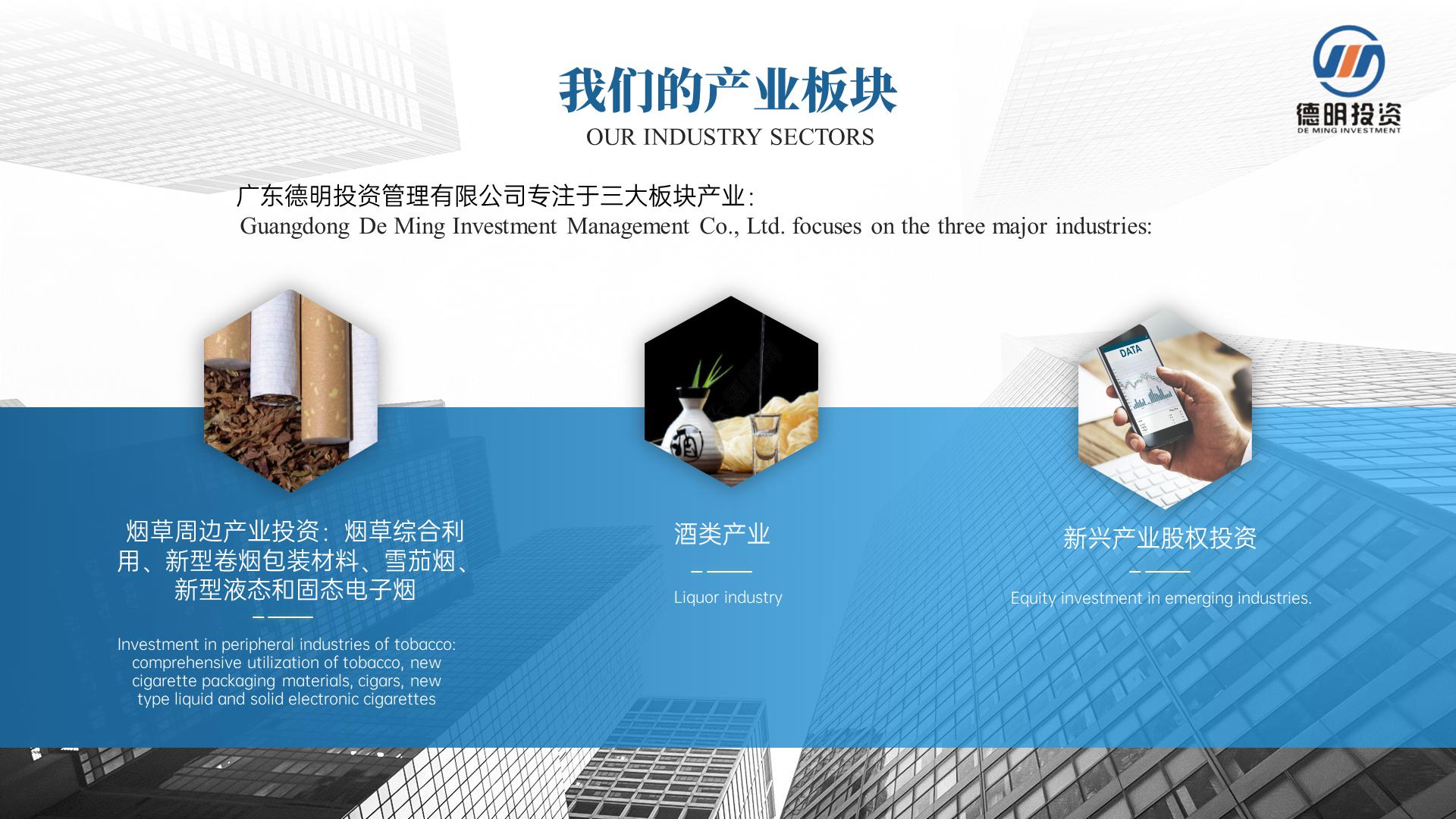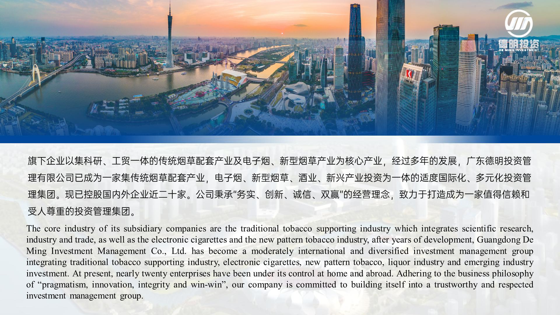 上海帛明投資管理有限公司創建于2011年,注冊資金4億元人(rén)民币,總部位于美麗(lì)的濱海城市廣東汕頭。旗下企業以集科、工、貿一體(tǐ)的傳統煙草包裝配套産業及新型煙草産業為(wèi)核心産業,經過多(duō)年的發展,如今,上海帛明投資管理有限公司已成為(wèi)一家(jiā)集傳統煙草包裝及新型煙草業、酒業、相關新興産業投資為(wèi)一體(tǐ)的适度國際化、多(duō)元化投資管理(lǐ)集團。現已控股國內(nèi)外企業近二十多(duō)家(jiā)。公司秉承“務實、創新、誠信、雙赢”的經營理(lǐ)念,緻力于打造成為(wèi)一家(jiā)值得(de)信賴和(hé)受人(rén)尊重的投資管理(lǐ)集團。