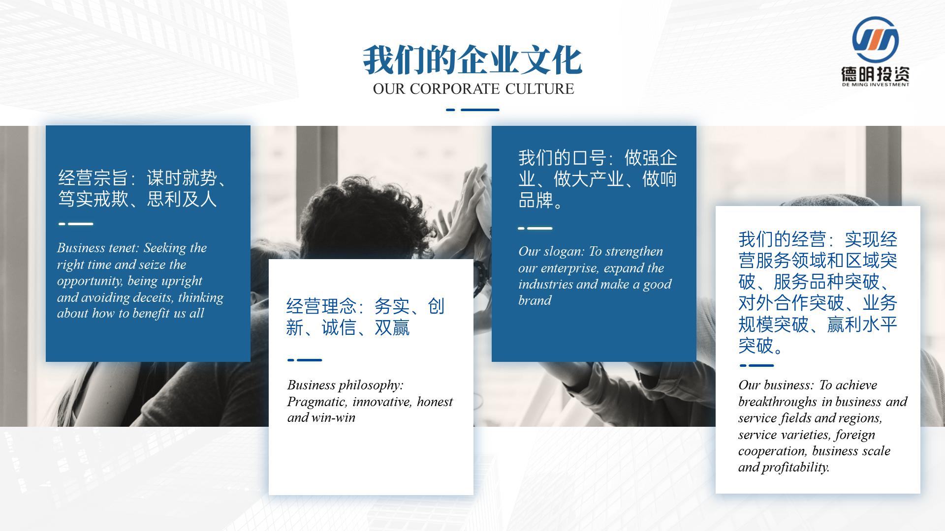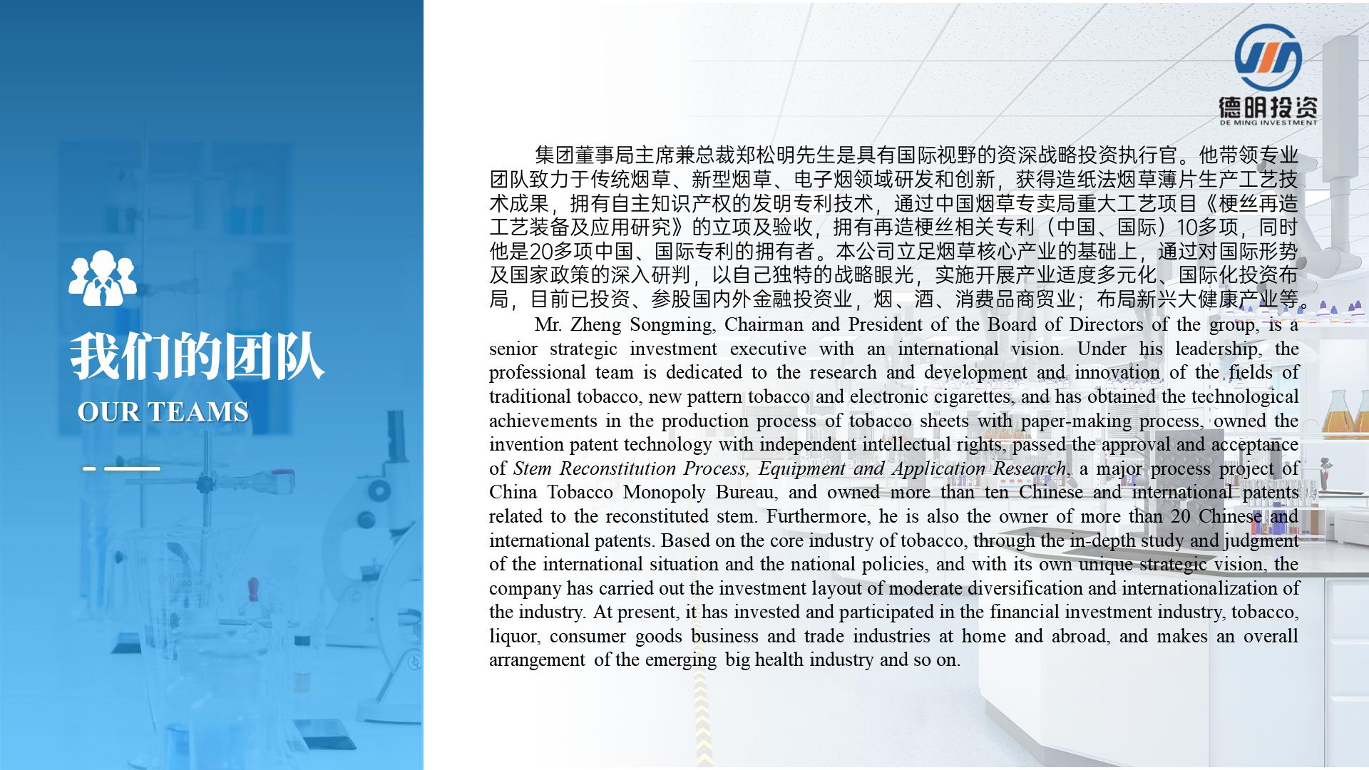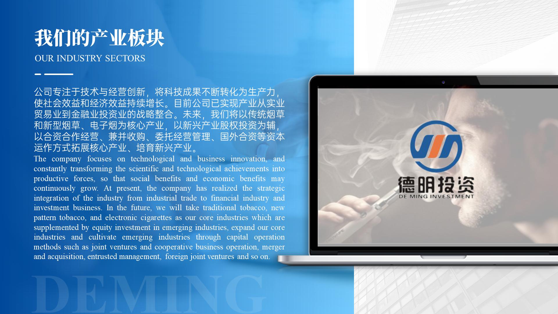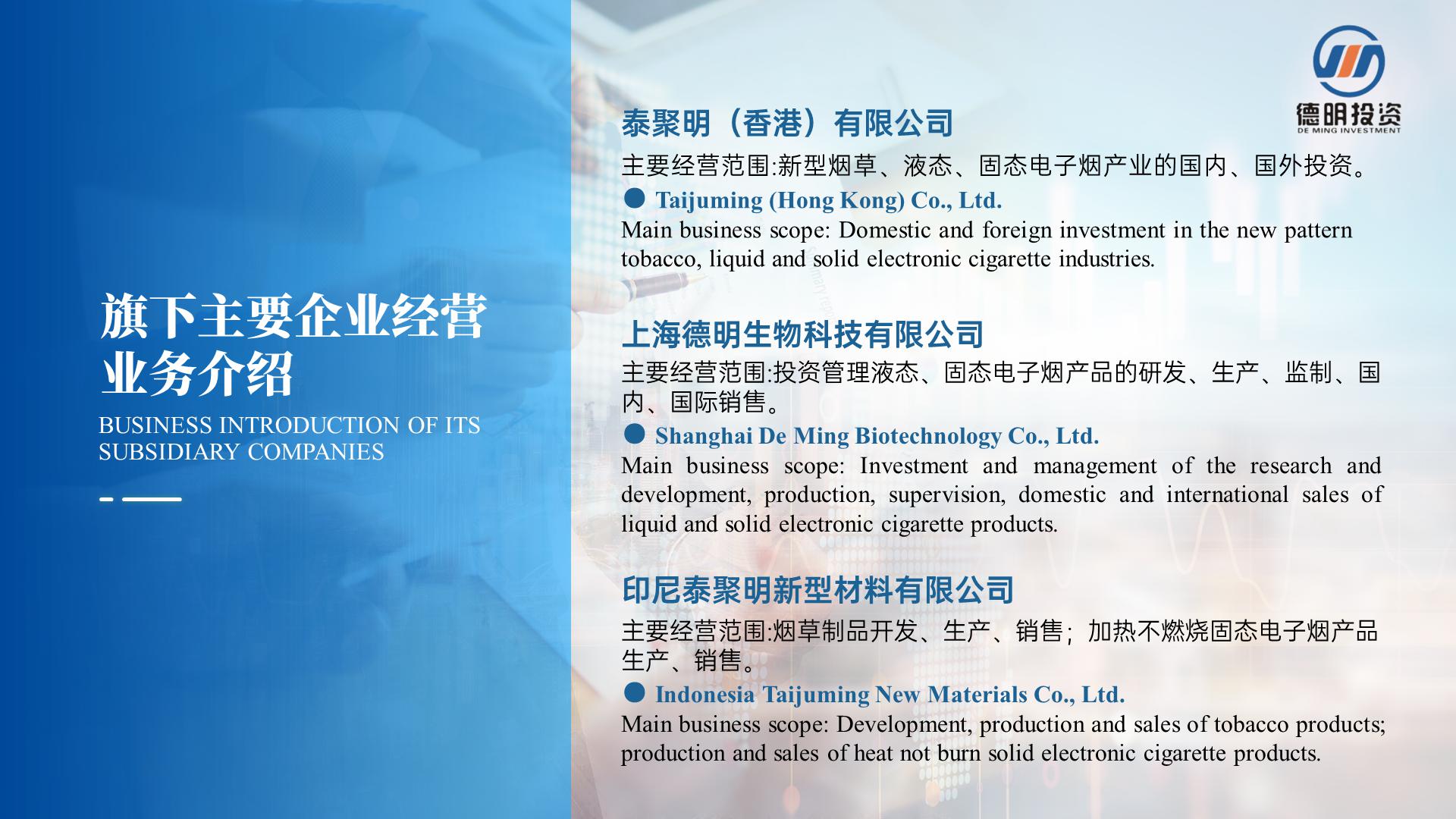 上海帛明投資管理有限公司創建于2011年,注冊資金4億元人(rén)民币,總部位于美麗(lì)的濱海城市廣東汕頭。旗下企業以集科、工、貿一體(tǐ)的傳統煙草包裝配套産業及新型煙草産業為(wèi)核心産業,經過多(duō)年的發展,如今,上海帛明投資管理有限公司已成為(wèi)一家(jiā)集傳統煙草包裝及新型煙草業、酒業、相關新興産業投資為(wèi)一體(tǐ)的适度國際化、多(duō)元化投資管理(lǐ)集團。現已控股國內(nèi)外企業近二十多(duō)家(jiā)。公司秉承“務實、創新、誠信、雙赢”的經營理(lǐ)念,緻力于打造成為(wèi)一家(jiā)值得(de)信賴和(hé)受人(rén)尊重的投資管理(lǐ)集團。